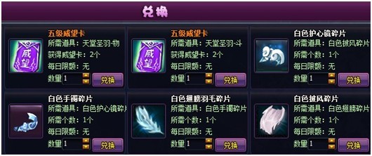 2、 在【兑换】界面新增【物品】兑换,使用天堂圣羽可以兑换10w威望,使用时装升阶材料可以互相兑换其他时装升阶材料。