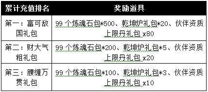 1、 活动期间内,只要您在活动期间累计充值150000元宝及以上,且在当前服务器充值玩家中充值排名前三的玩家,即可获得大奖;