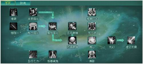 佛心:最高等级5级,增加角色生命值1500/2200/2900/3600/4300,需分配不灭系天赋点数20点。